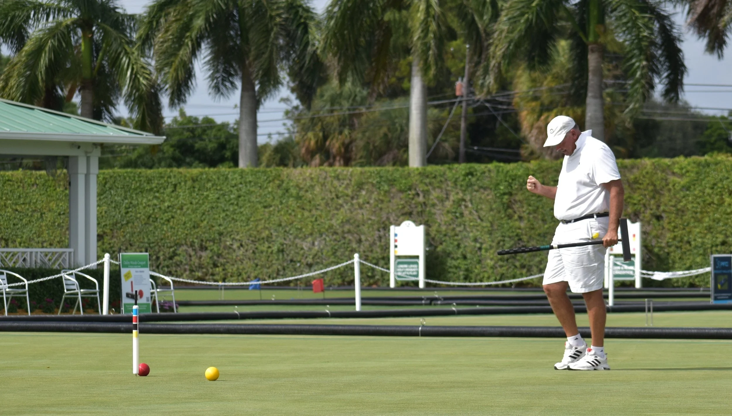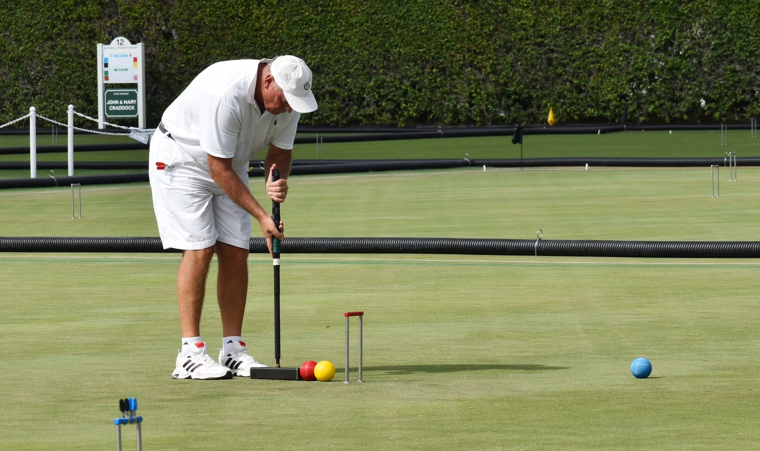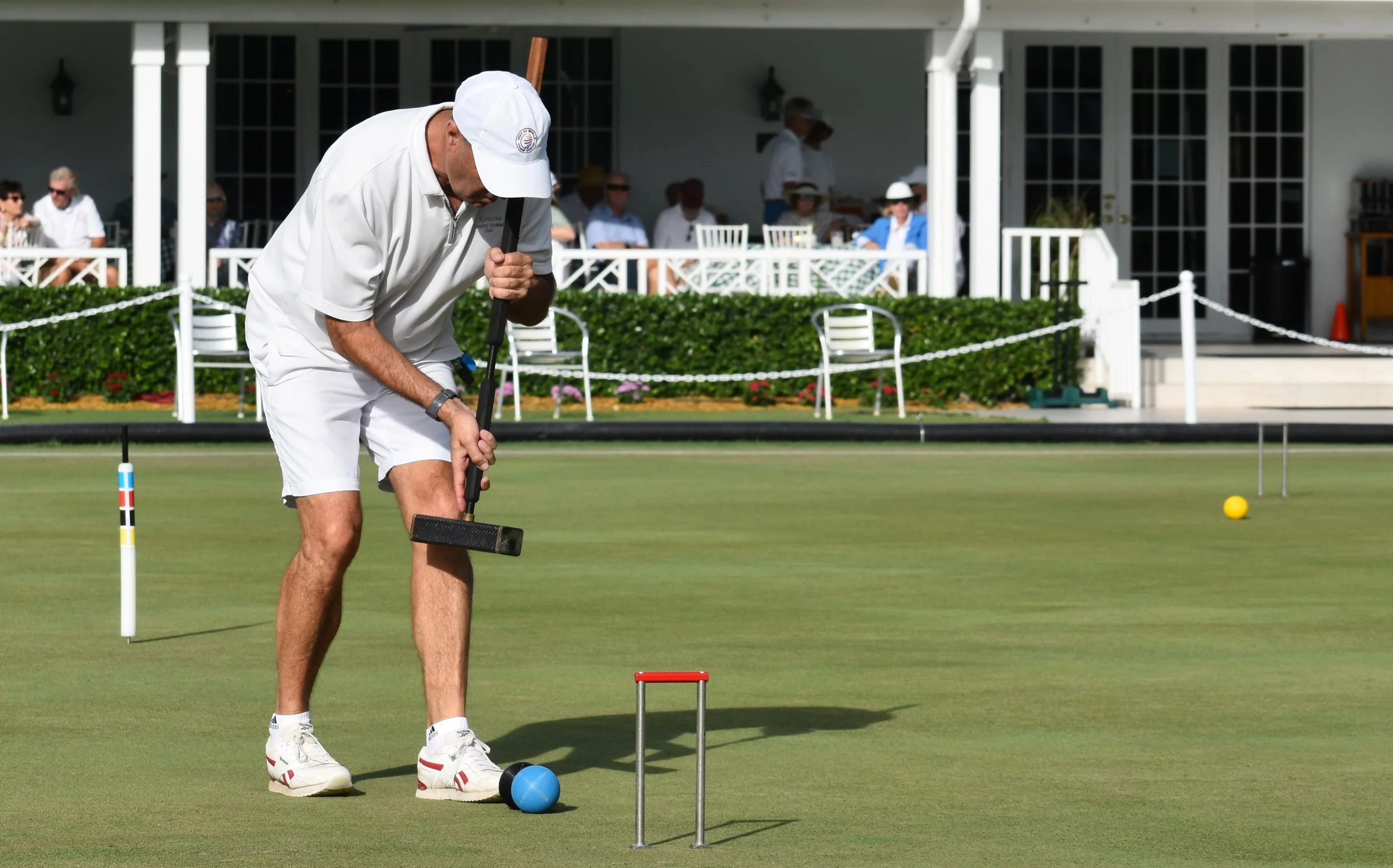 Bamford picked up the easy break, ran it around and set his preferred DSL. Avery lifted the western ball and shot from A Baulk and missed the boundary red ball just to the left. There was a bit of a discussion about the placement of blue, but once that was settled, Bamford set off on a match-winning triple attempt with red. He got the 4B and Penult peels as planned and did have an angled hoop shot at 3B that looked a bit tricky, but he smoothed it through easily. He had a hoop-and-roquet moment at Penult on black that meant he would only have the blue ball as a safety valve at rover, but yellow’s position was close enough to the hoop to make it manageable. He navigated the peel and hoop with no issues. His four-yard peg out from the east successfully put both balls into the peg and he offered his traditional tip of the cap to the appreciative crowd on covered porch of the NCC. The 3-0 victory extended his triple-peel streak to 15 games and capped a flawless 14-0 knockout run to claim the title of 2025 WCF AC World Champion.