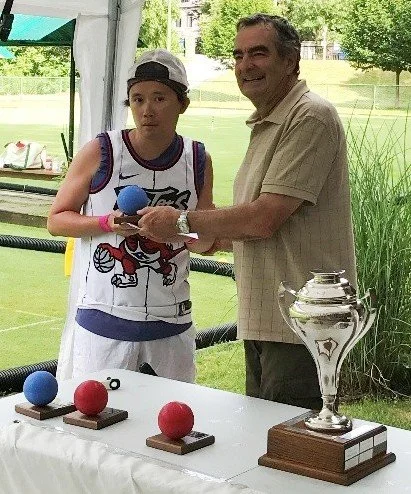 First Flight winner KS Tsang with Croquet Canada President Jim Wright presenting